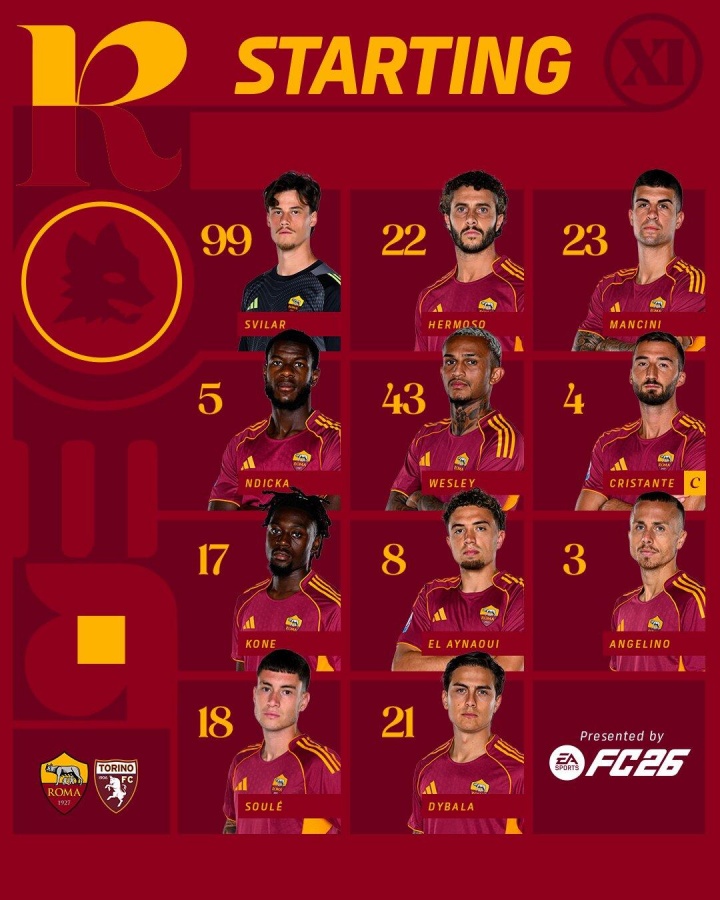 罗马首发:99-斯维拉尔、22-埃尔莫索、23-曼奇尼、5-恩迪卡、43-韦斯利、3-安吉利诺、4-克里斯坦特、17-科内、8-艾纳维、18-苏莱、21-迪巴拉