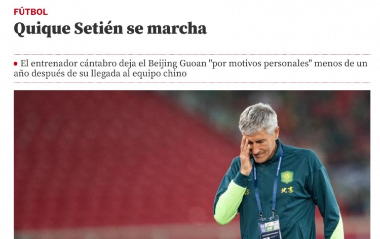 10月6日讯 日前,西班牙媒体《马卡报》、《世界体育报》报道了北京国安主帅塞蒂恩因“个人及家庭原因”辞职的消息。