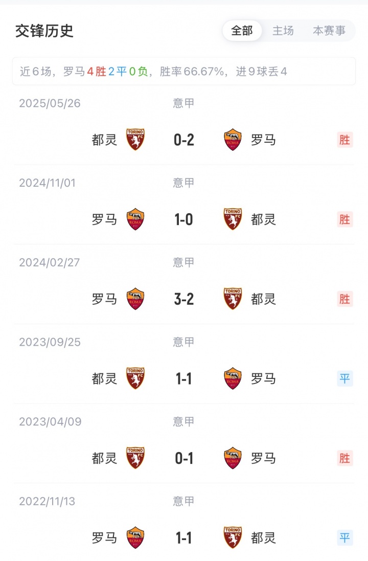 意甲前两轮,罗马取得两连胜+0失球,积6分;都灵一负一平一球未进,积1分。